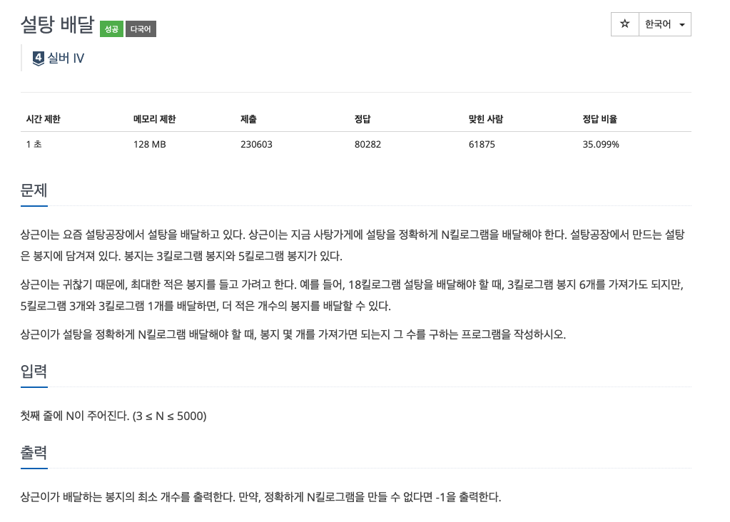 그리디 알고리즘을 통해 설탕을 가장 적은 개수의 봉지로 배달하려면 3kg보다 5kg으로 나누어 떨어지는 것이 좋다.