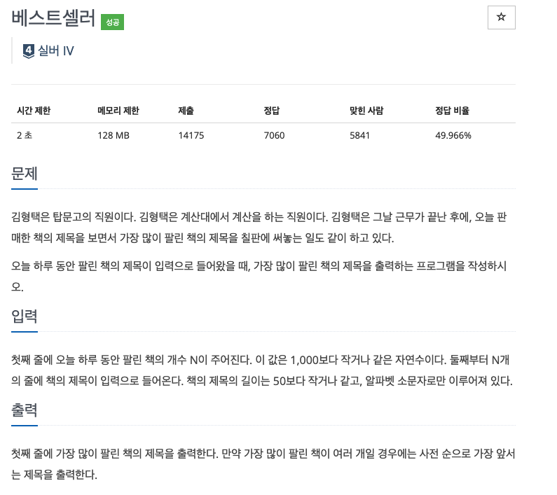 문제의 요구사항은 가장 많이 팔린 책의 제목을 출력하고, 만약 가장 많이 팔린 책이 여러 개일 경우에는 사전 순으로 가장 앞에 있는 책의 제목을 출력하는 것이었다.