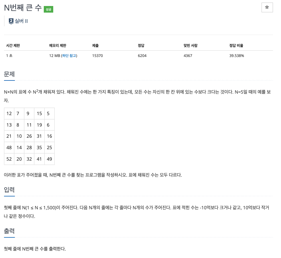처음에는 문제의 메모리 제한과 모든 수는 자신의 한 칸 위에 있는 수보다 크다는 조건 때문에 표의 일부분만 뽑은 그룹에서 N번째 큰 수를 찾으려고 했다. 그렇게 벡터를 사용해서 구현을 했고 테스트케이스는 통과해서 제출했지만 오답이었다.