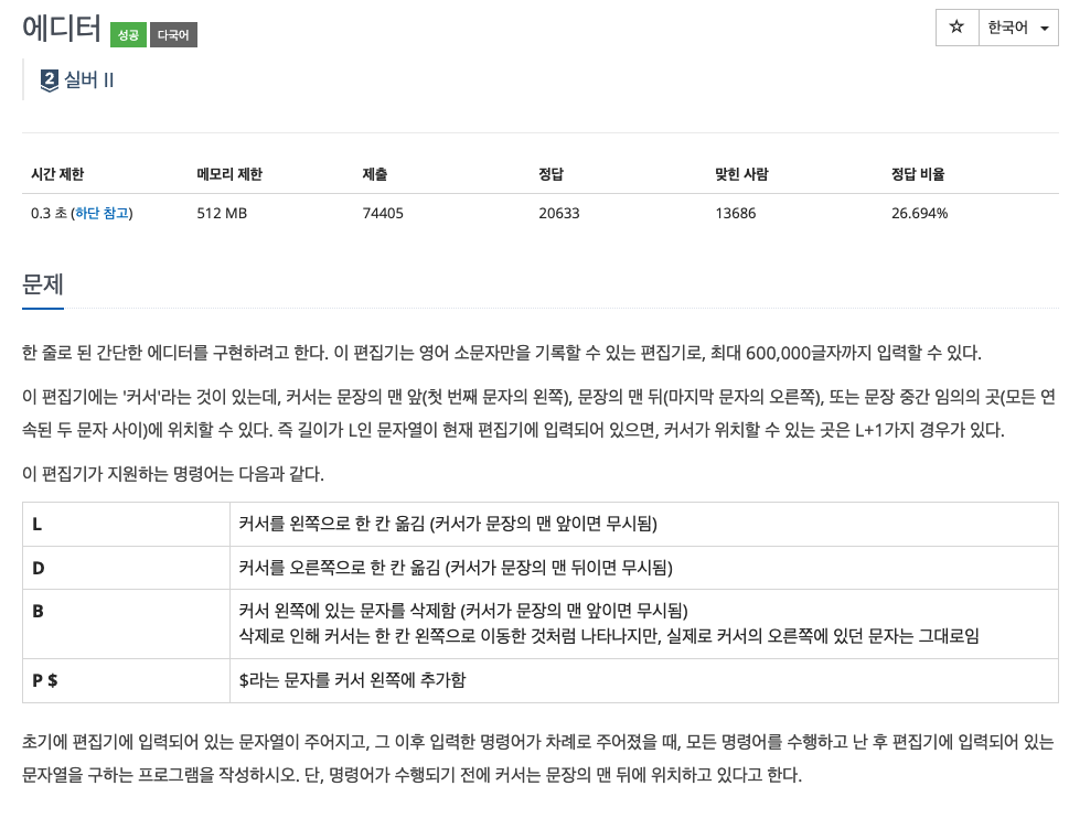 문자열을 입력받고 가상의 커서가 존재해서 문자와 문자 사이를 왔다 갔다 하며 삭제하거나 추가하는 기능을 구현하면 된다.