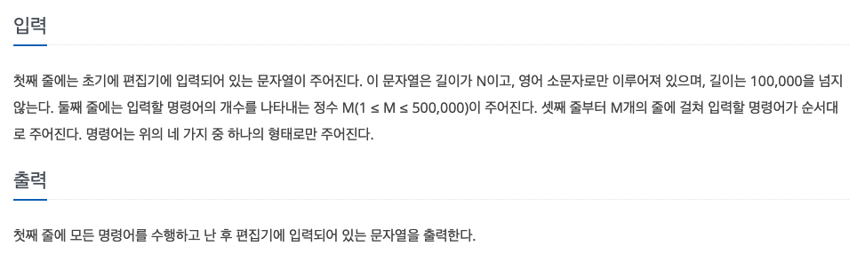첫째 줄에는 초기에 편집기에 입력되어 있는 문자열이 주어진다. 이 문자열은 길이가 N이고, 영어 소문자로만 이루어져 있으며, 길이는 100,000을 넘지 않는다. 둘째 줄에는 입력할 명령어의 개수