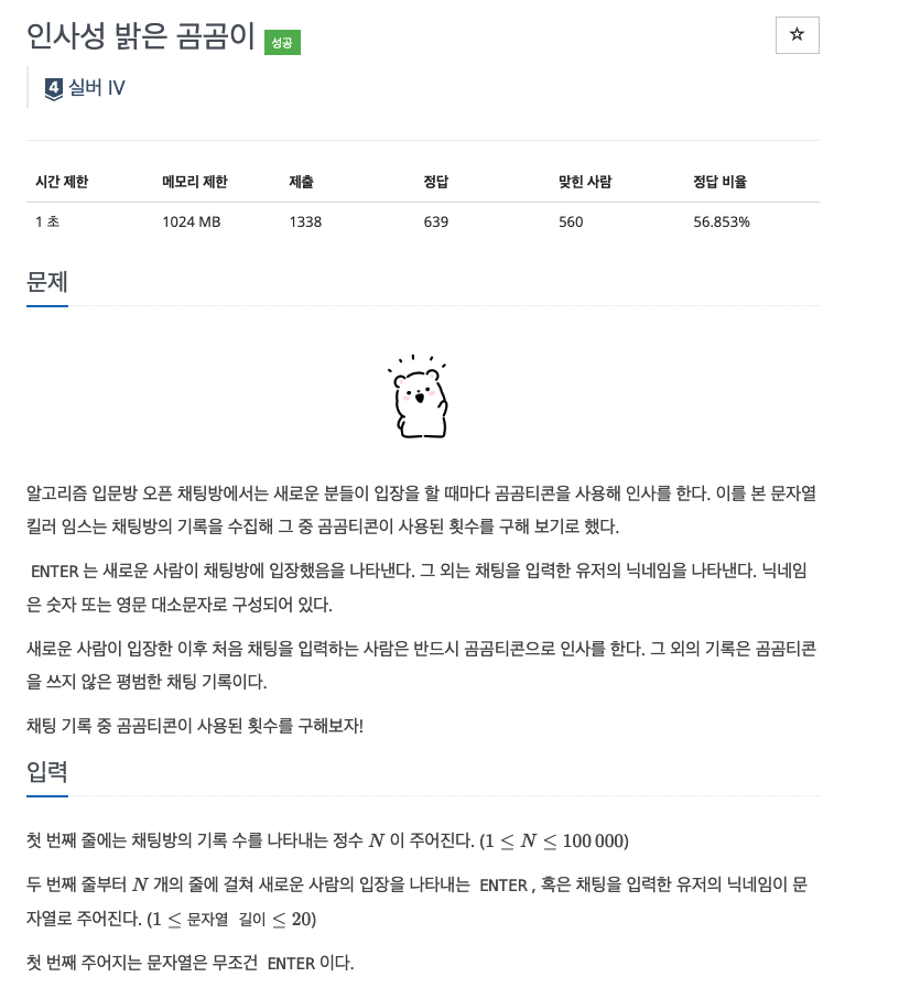 따라서 ENTER가 입력된 후에 처음 등장한 닉네임의 숫자만 세주면 된다.