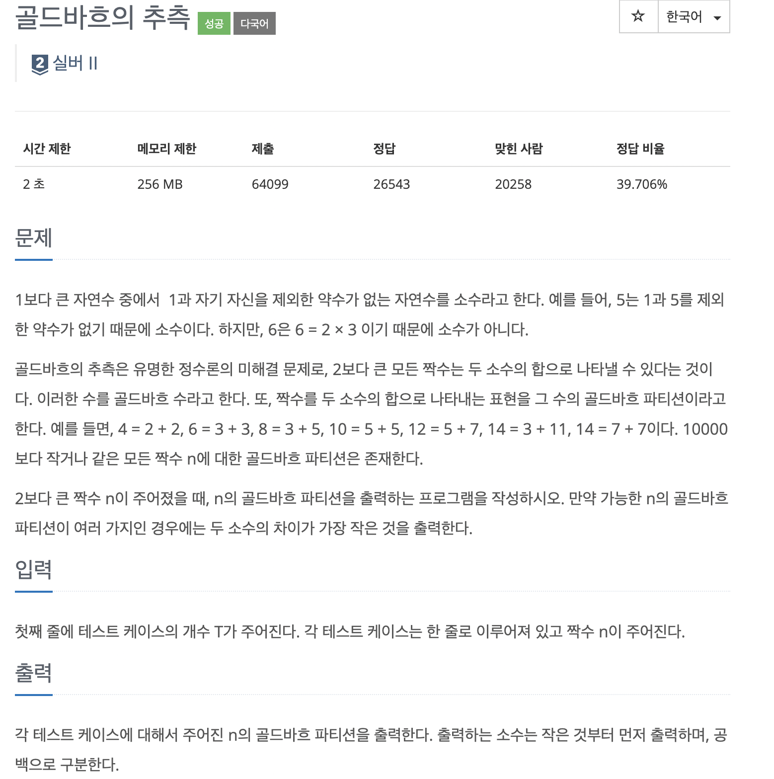 골드바흐라는 분께서 추측하신 정수론의 미해결 문제를 구현하는 문제이다.