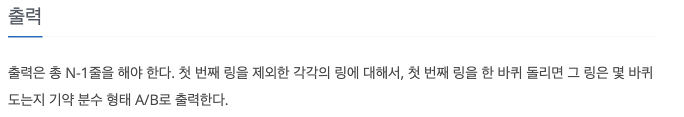 출력은 총 N-1줄을 해야 한다. 첫 번째 링을 제외한 각각의 링에 대해서, 첫 번째 링을 한 바퀴 돌리면 그 링은 몇 바퀴 도는지 기약 분수 형태 A/B로 출력한다.