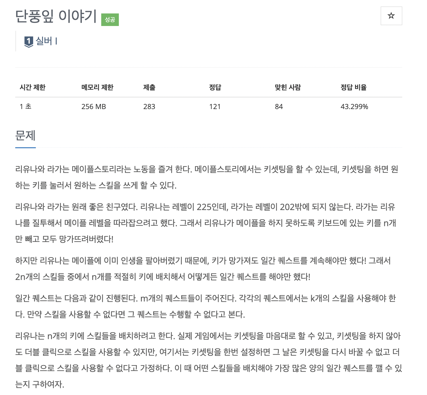 m개의 퀘스트가 존재한다. 각 퀘스트는 k개의 스킬을 써서 완료할 수 있다.
