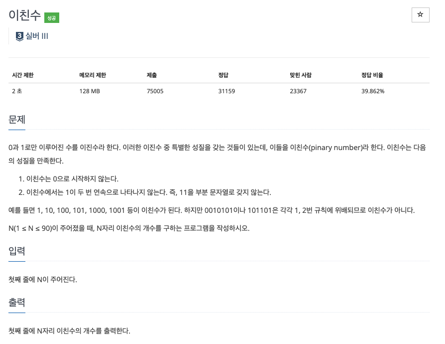 n이 입력됐을 때 n자리 이친수의 개수를 출력하면 된다.