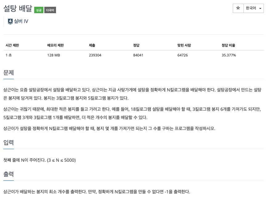 설탕을 n킬로그램을 배달해야 한다.