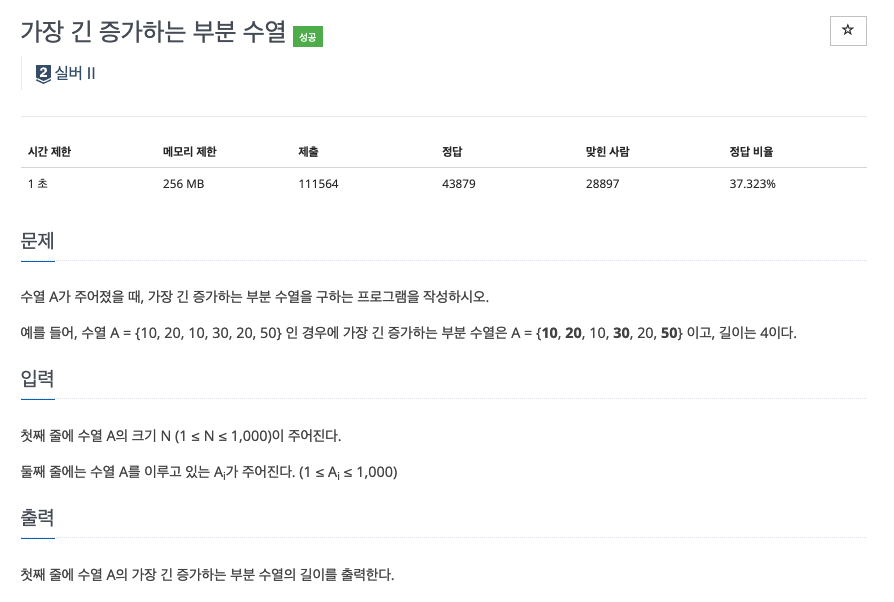 수열 A 중 가장 긴 증가하는 부분 수열의 길이를 출력하면 된다.