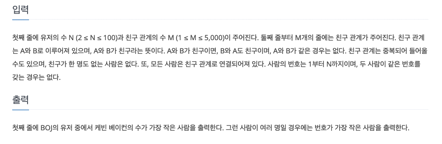첫째 줄에 유저의 수 N (2 ≤ N ≤ 100)과 친구 관계의 수 M (1 ≤ M ≤ 5,000)이 주어진다. 둘째 줄부터 M개의 줄에는 친구 관계가 주어진다. 친구 관계는 A와 B로 이루어져 있으며, A와 B가 친구라는 뜻