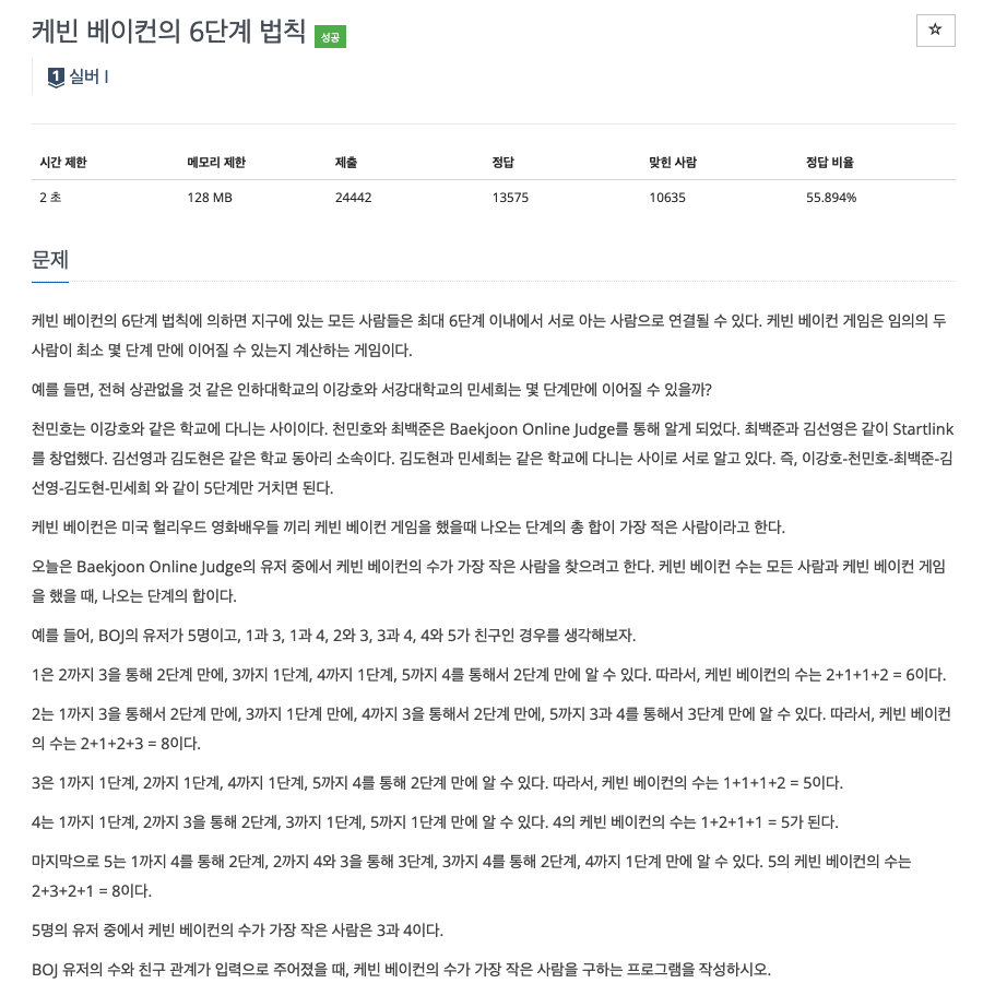 존재하는 정점들 중 한 정점에서 다른 모든 정점으로 가는 거리들을 모두 더한 값을 케빈 베이컨 수라고 한다.