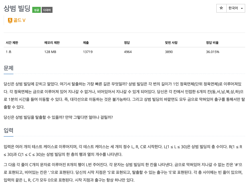 당신은 상범 빌딩에 갇히고 말았다. 여기서 탈출하는 가장 빠른 길은 무엇일까? 상범 빌딩은 각 변의 길이가 1인 정육면체(단위 정육면체)로 이루어져있다. 각 정육면체는 금으로 이루어져 있어