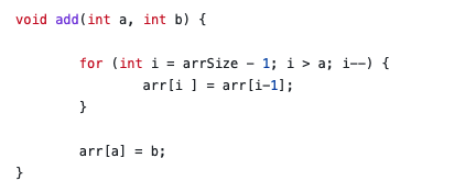 1. 배열의 크기 - 1부터 a까지 for문을 순회하며 b가 삽입될 a번째 인덱스를 확보하기 위해 한 칸씩 뒤쪽으로 값들을 이동시킨다.