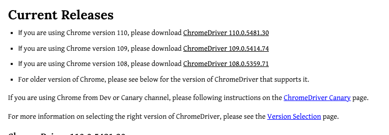 Current Releases If you are using Chrome version 110, please download ChromeDriver 110.0.5481.30 If you are using Chrome version 109, please download ChromeDriver 109.0.5414.74 If you are using Chrome version 108, please download ChromeDriver 108.0.5359.71