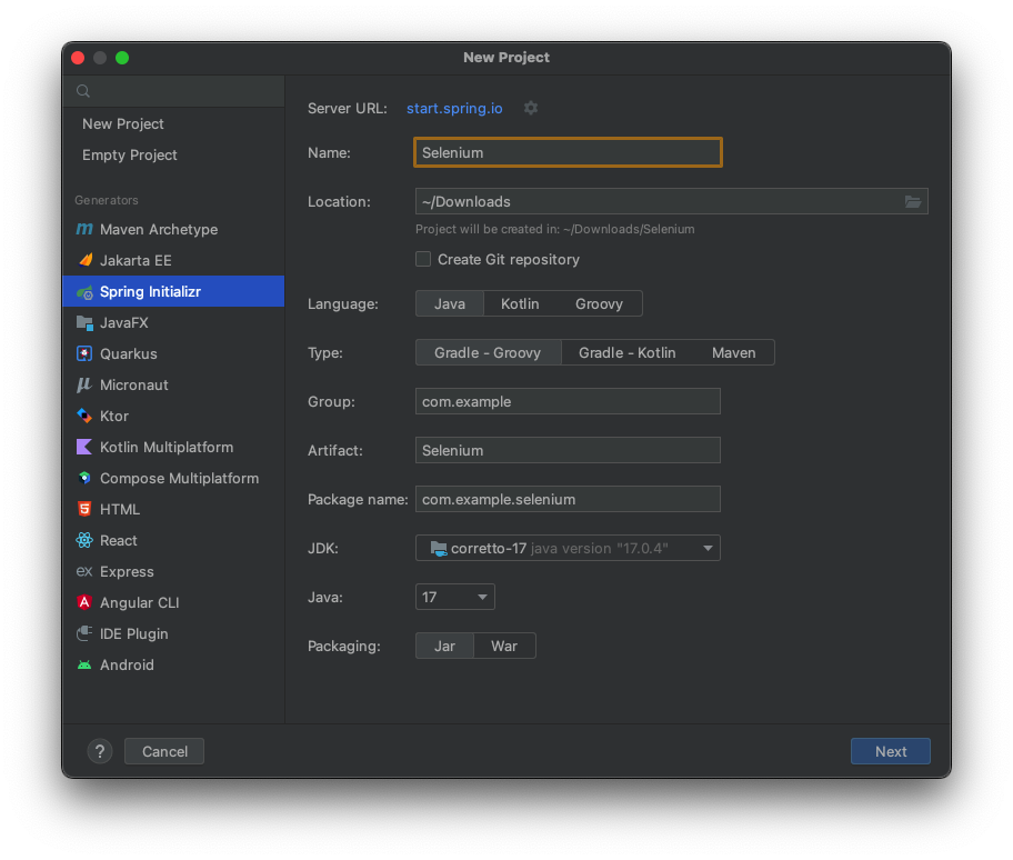 타입은 Gradel-Groovy, JDK는 17, Packagin은 Jar로 했습니다.