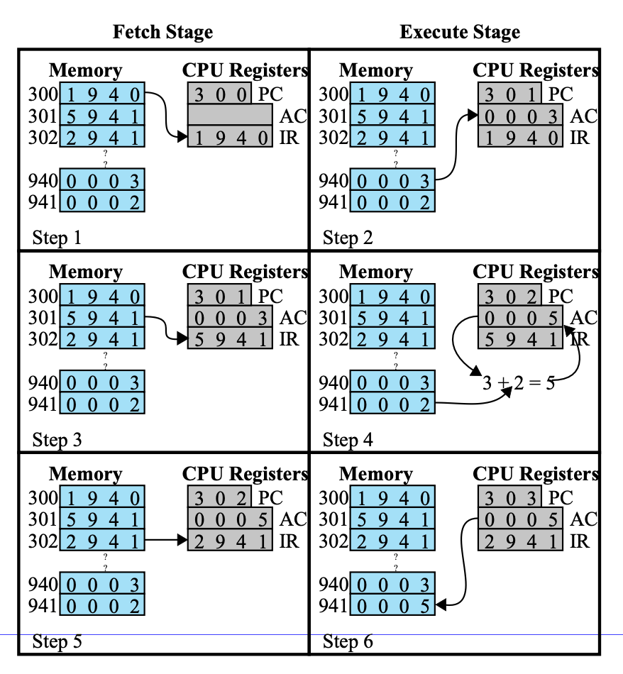 이 과정에서 메모리 주소 레지스터(MAR)와 메 모리 버퍼 레지스터(MBR)가 이용된다. 설명을 간단히 하기 위해 이들 중간 단계 레지스터는 보이고 않았다. - IR 내의 첫 번째 4비트는 메모리에 저장된 값이 AC에 적재될 것을 나타낸다. 나머지 12비트(3개의 16진수)는 그 주소 940을 명시한다.