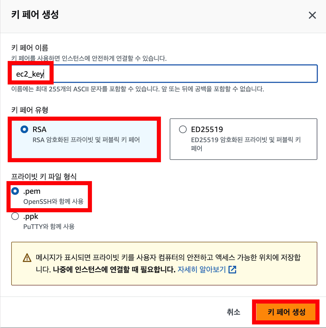 키 페어 이름은 본인이 원하시는 이름으로 입력해 주시고, 키 페어 유형은 "RSA", 프라이빗 키 파일 형식은 ". pem"으로 선택해 주신 다음 "키 페어 생성"을 클릭해 주세요.