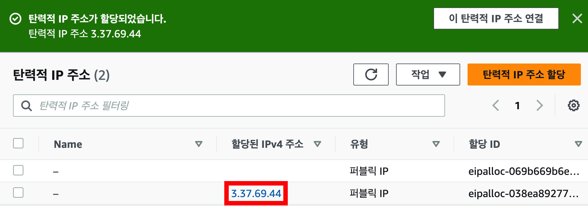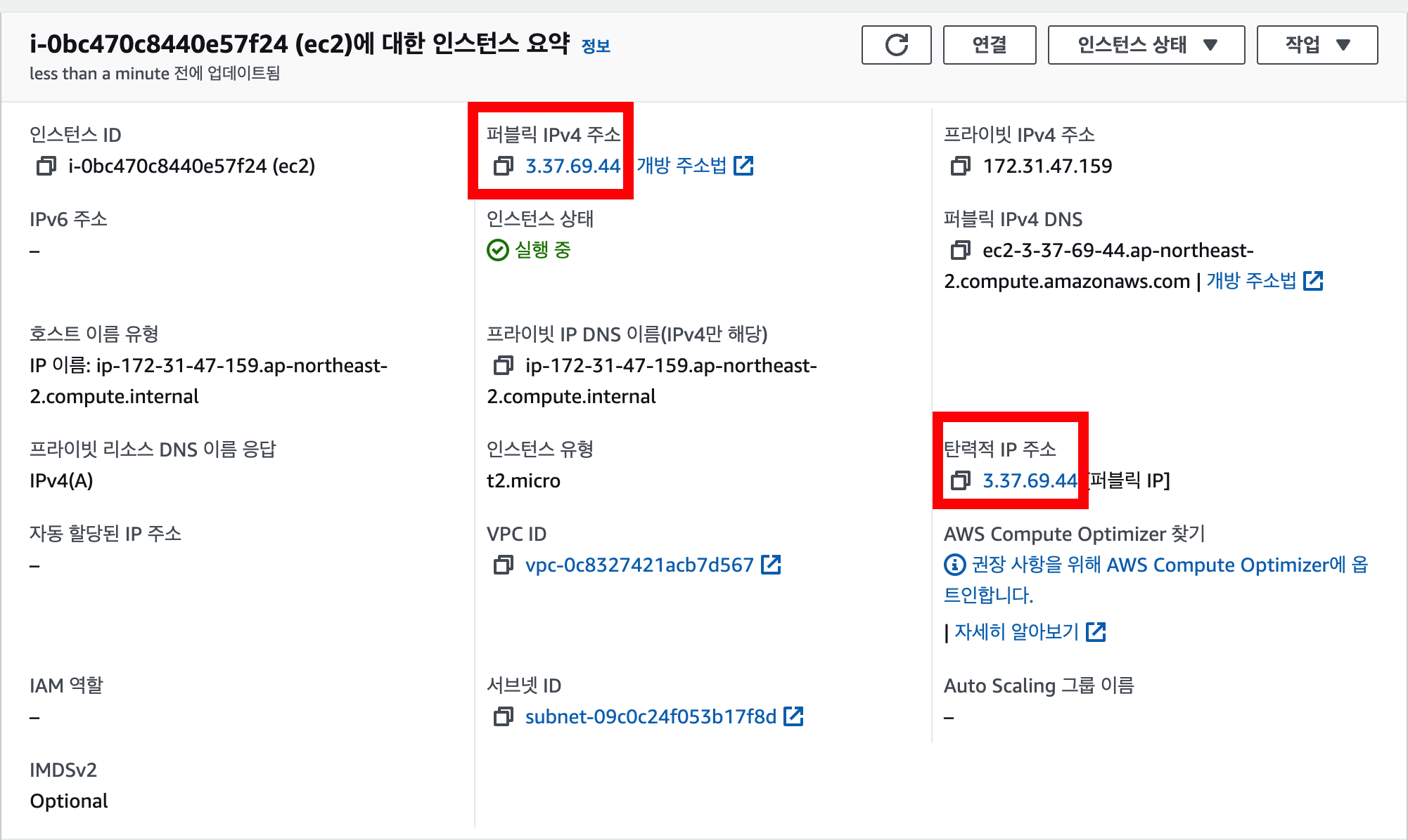 그러면 퍼블릭 주소와 탄력적 IP 주소에 연결한 탄력적 IP가 잘 연결된 것을 확인할 수 있습니다!