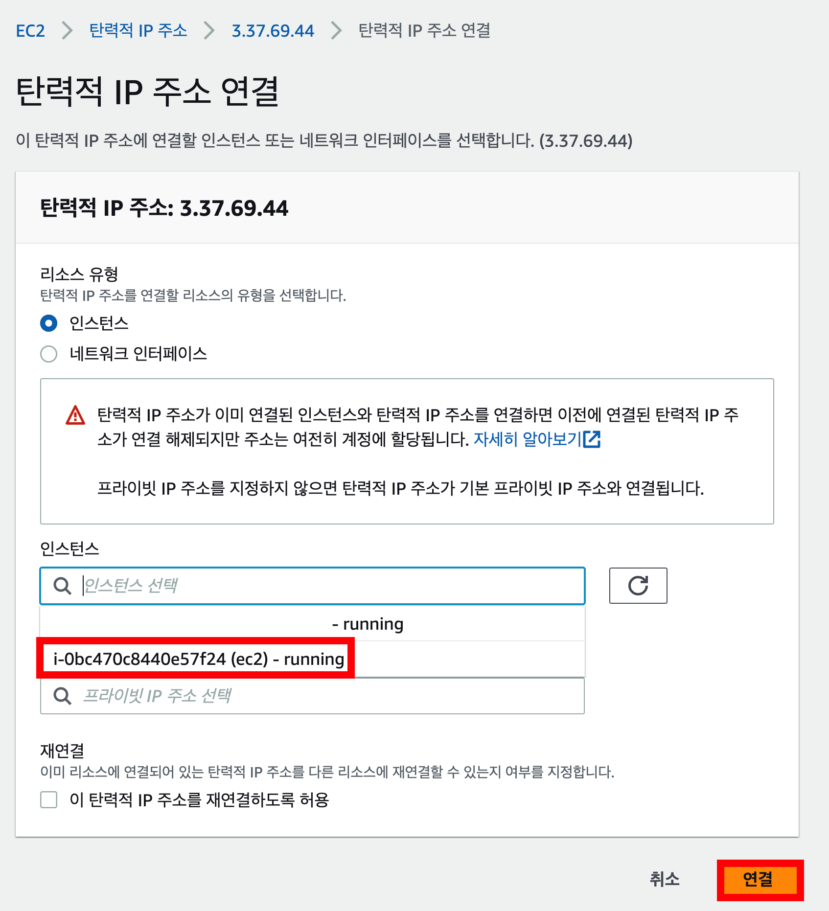 탄력적 IP 주소를 연결할 인스턴스를 선택합니다. 아까 생성한 인스턴스를 선택해 줍니다.