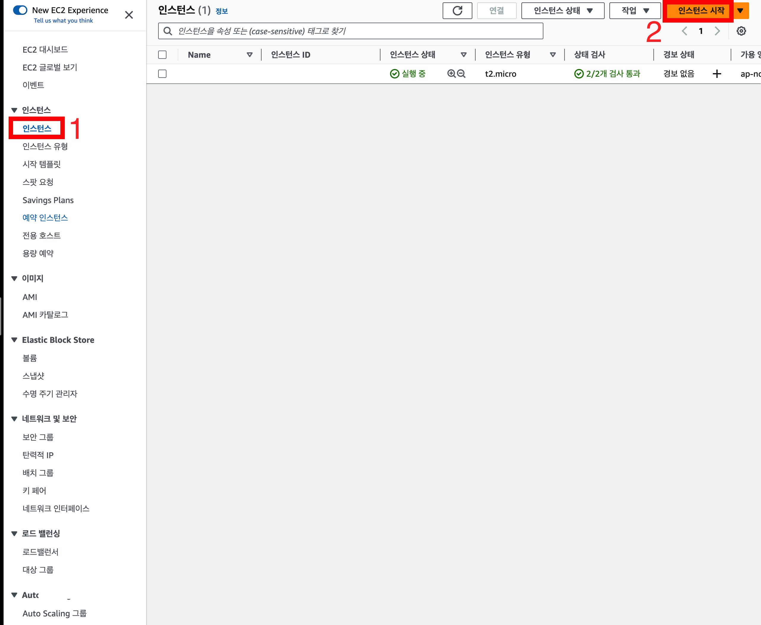왼쪽 메뉴바에서 "인스턴스"를 클릭한 후 보이는 화면의 우측 상단에 위치한 "인스턴스 시작"을 클릭해 주세요.