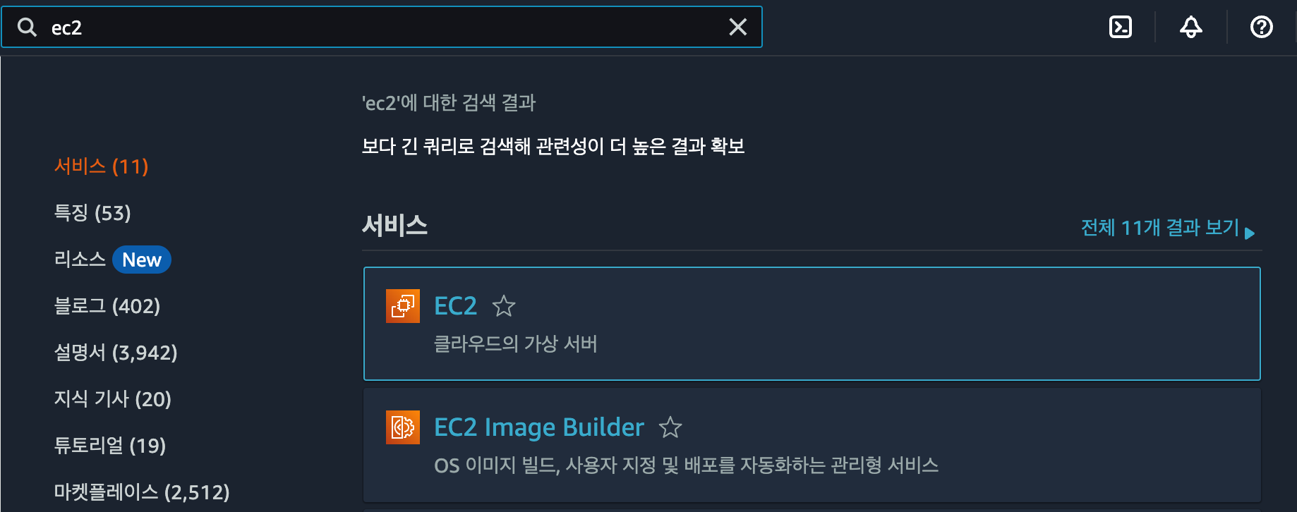 검색 창에 "ec2"를 검색하면 나오는 EC2 서비스를 클릭해 주세요.