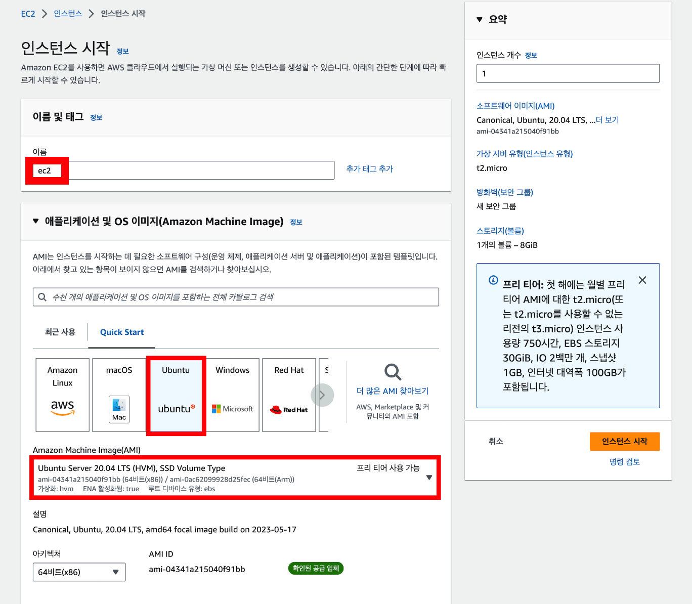 저는 Ubuntu를 사용할 것이기에 Ubuntu를 선택해 주고, 프리 티어로 사용 가능한 "Ubuntu Server 20.04 LTS"를 선택했습니다.