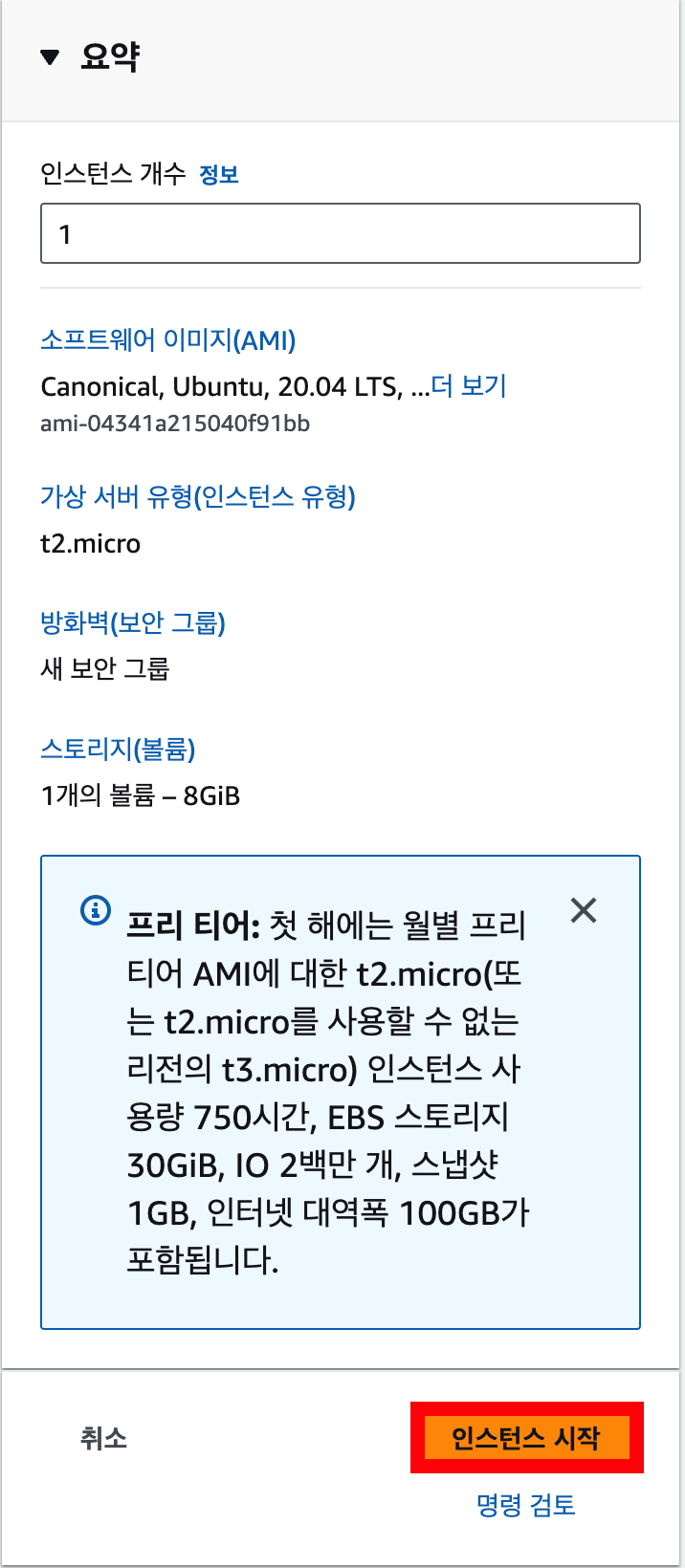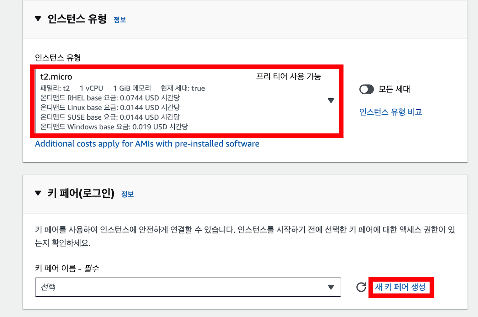 인스턴스 유형도 마찬가지로 프리 티어로 사용 가능한 "t2.micro"를 선택해 주세요.
