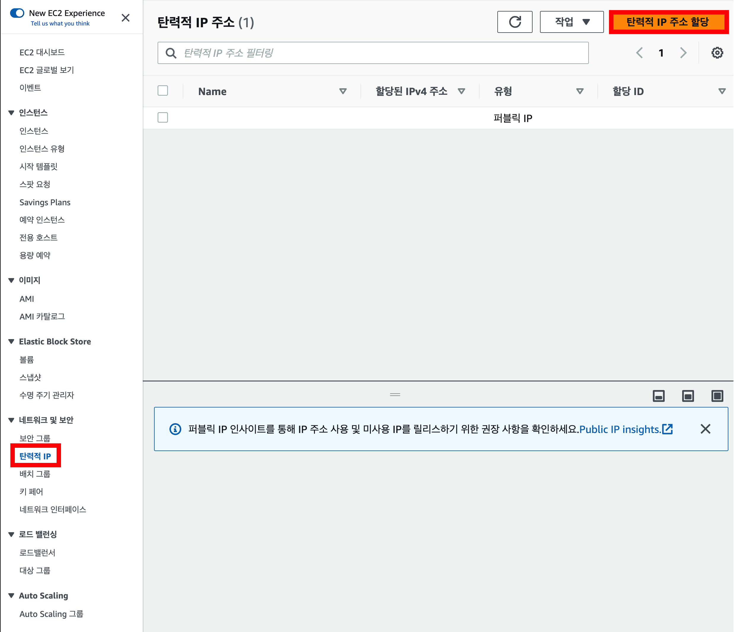 왼쪽 메뉴바에서 "탄력적 IP"를 클릭해 주시고, 우측 상단에 위치한 "탄력적 IP 주소 할당"을 클릭해 주세요.