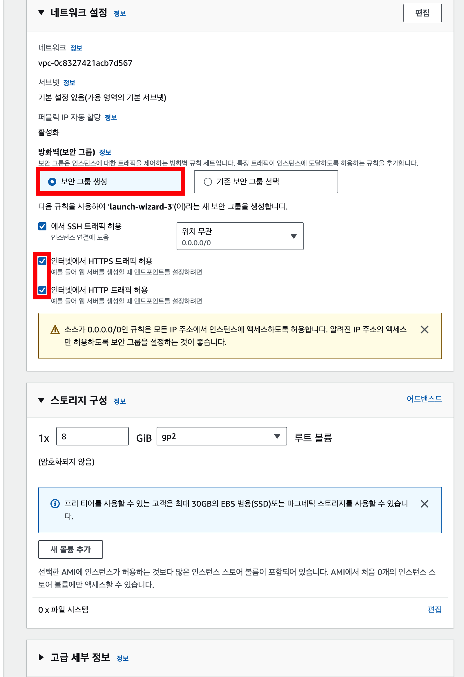 보안 그룹 생성을 선택해 주세요. 그리고 인터넷에서 HTTPS, HTTP 트래픽 허용을 체크해 주세요.