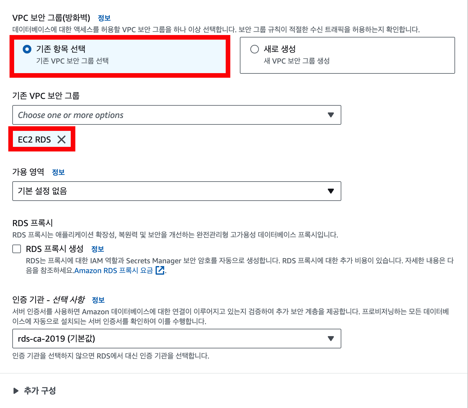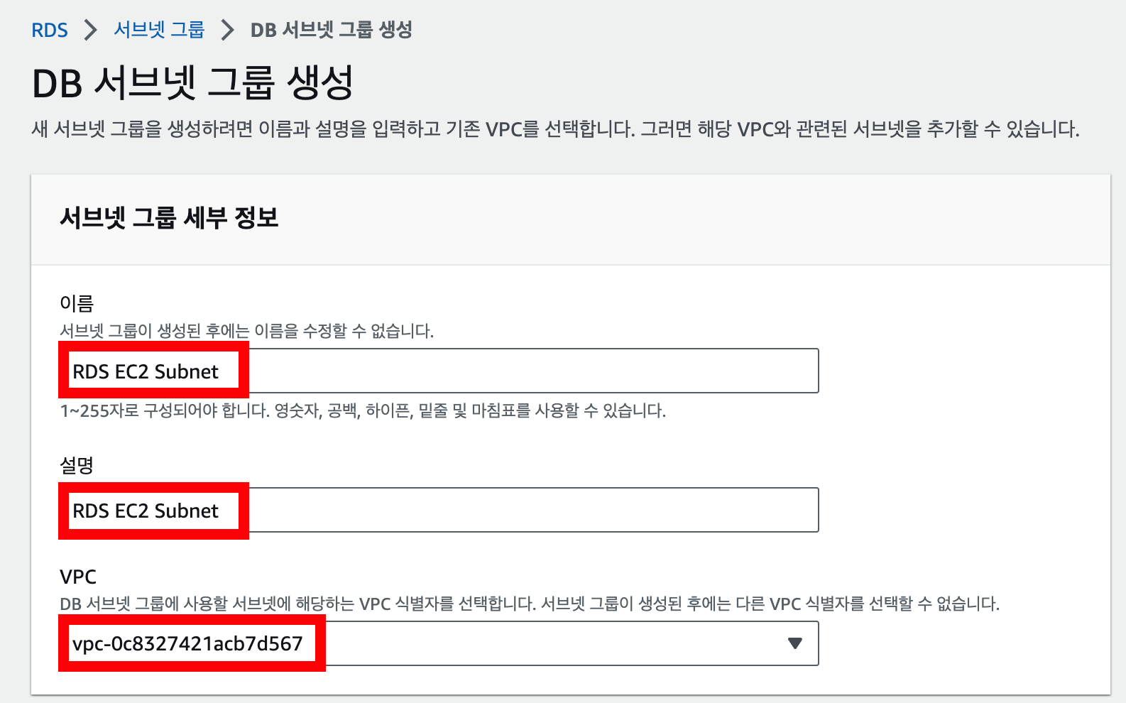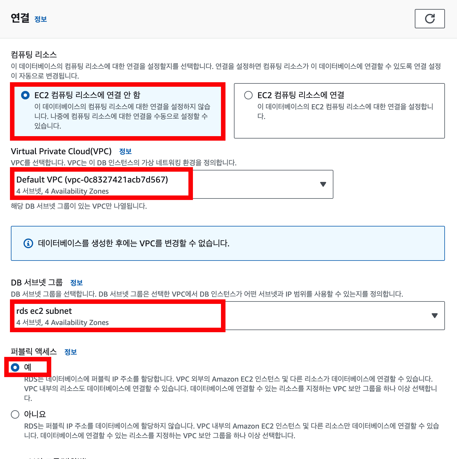 VPC는 EC2의 VPC로 선택, DB 서브넷 그룹은 아까 생성한 서브넷 그룹을 선택, 퍼블릭 액세스는 허용해 주세요.