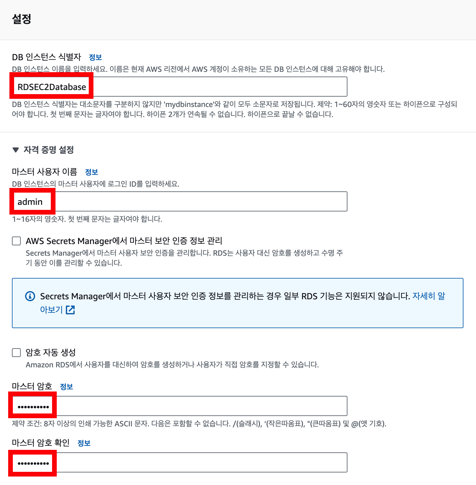 DB 인스턴스 식별자는 원하시는 대로 입력해 주세요.