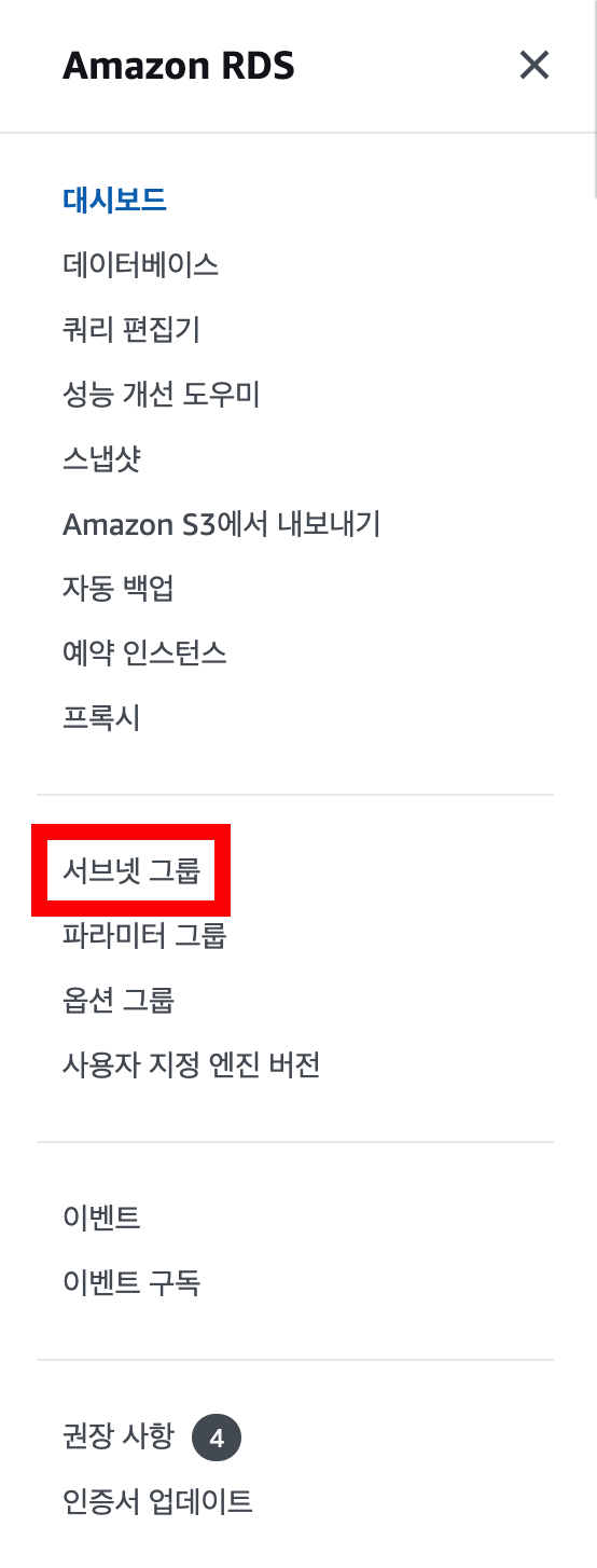 RDS 왼쪽 메뉴바에 위치한 "서브넷 그룹"을 클릭해 주세요.
