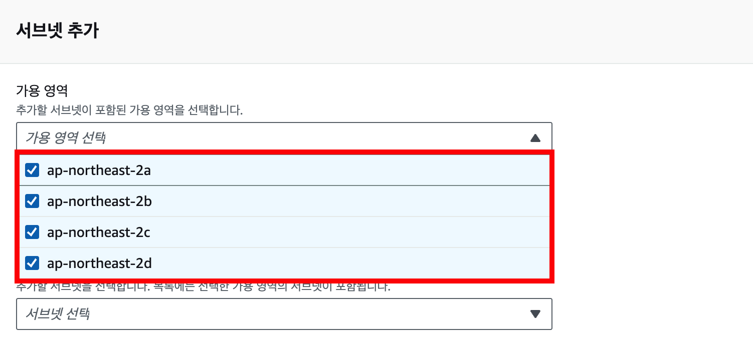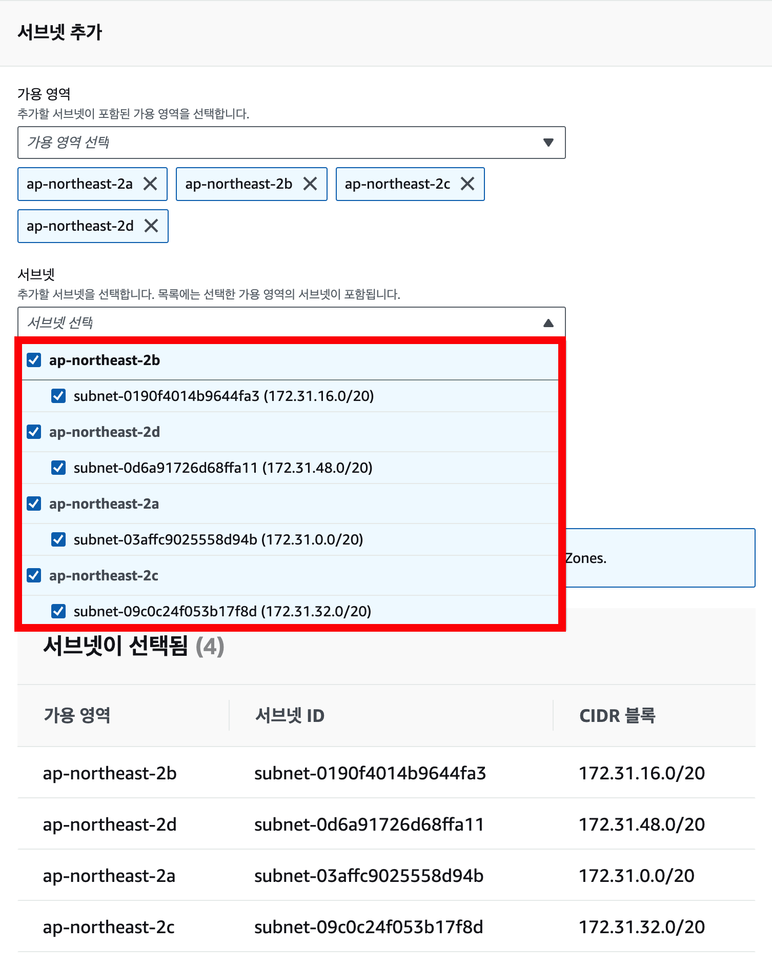 가용 영역과 서브넷 모두 다 체크해 주세요.