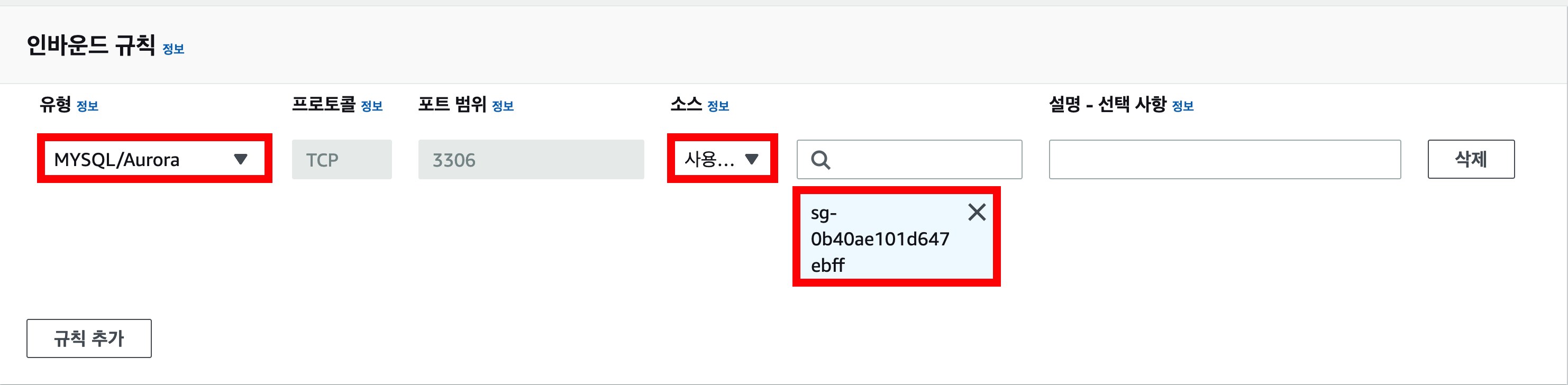 전 MySQL을 사용할 것이기에 유형은" MYSQL/Aurora", 소스는 "사용자 지정", 그리고 연동할 EC2 인스턴스의 보안 그룹으로 선택해 주세요.