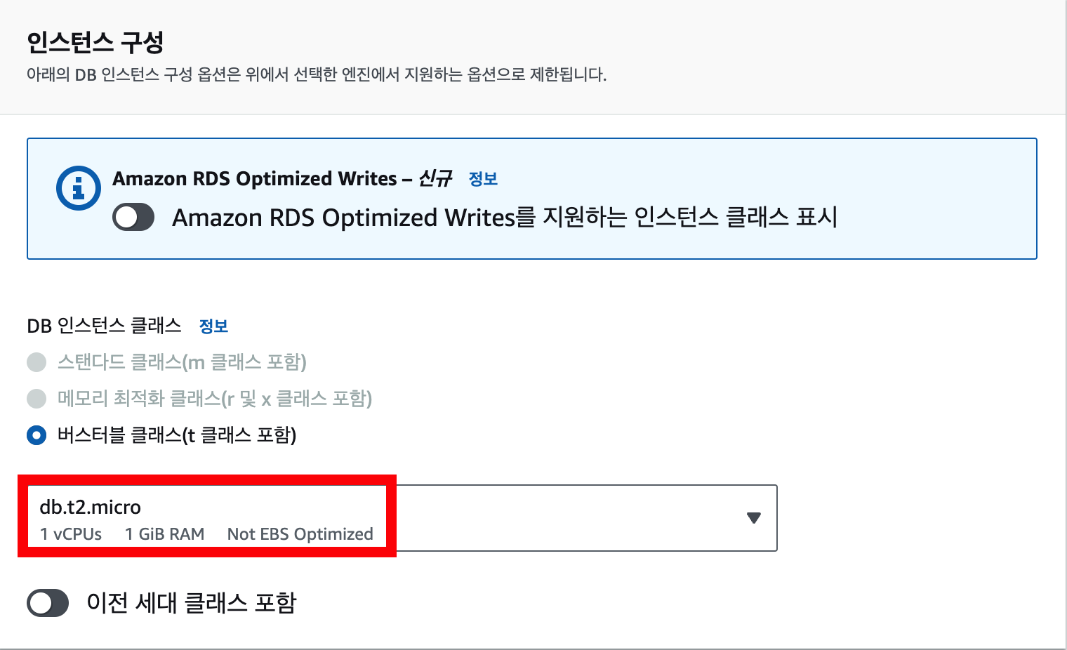 인스턴스 구성은 "db.t2.micro"로 선택했습니다.