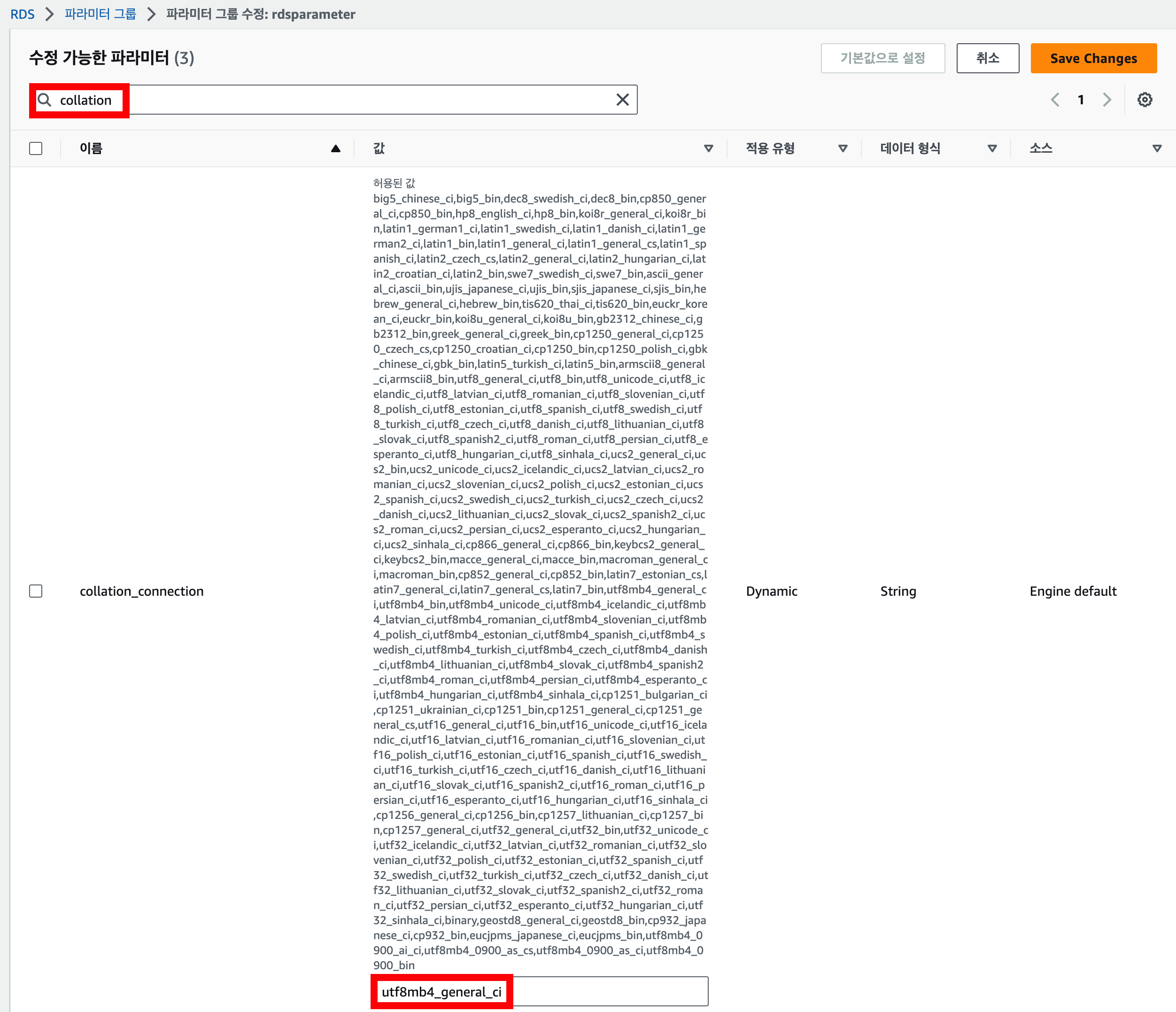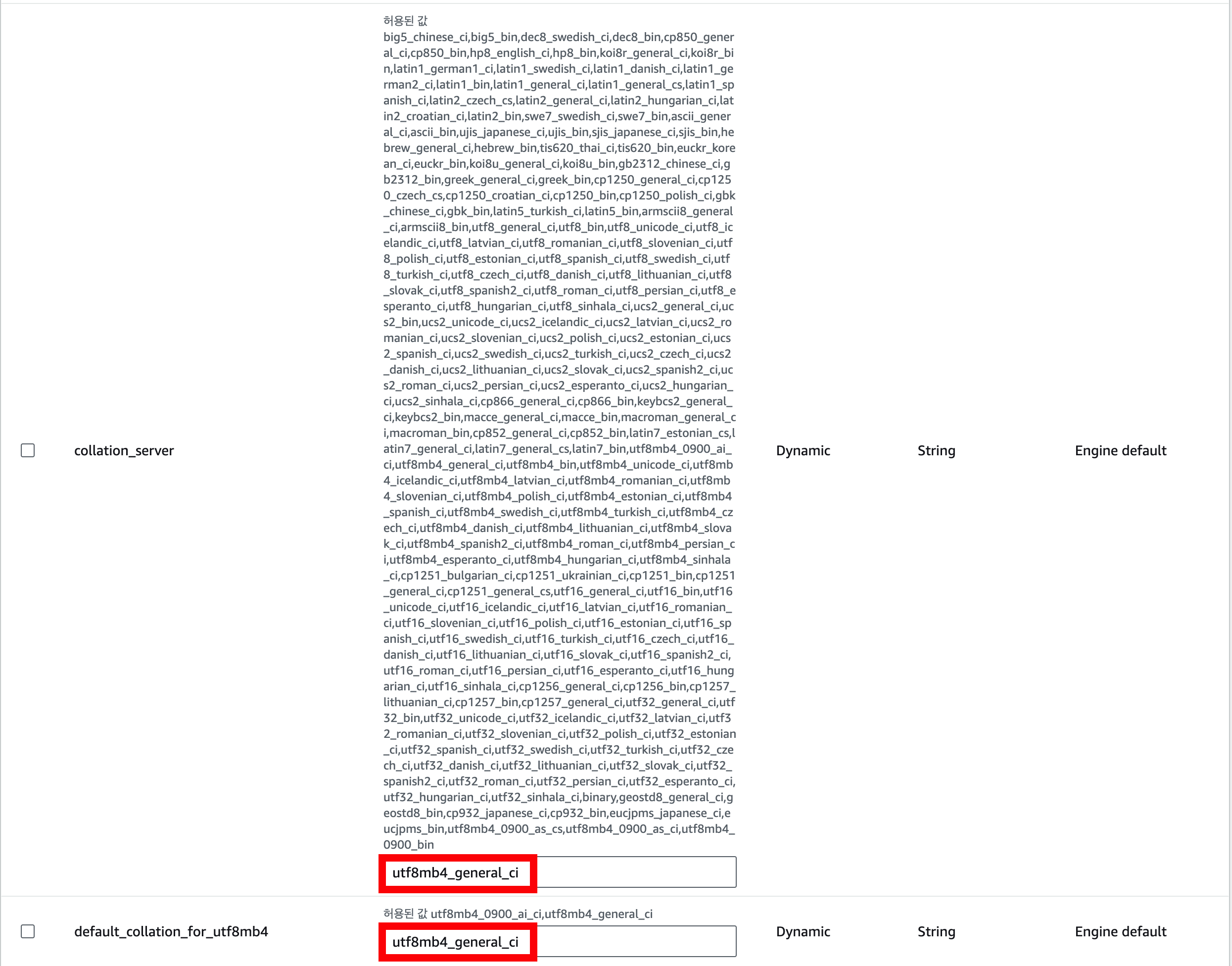검색창에 "collation"을 입력 후 모든 입력창에 "utf8mb4_general_ci"를 입력해 주세요.