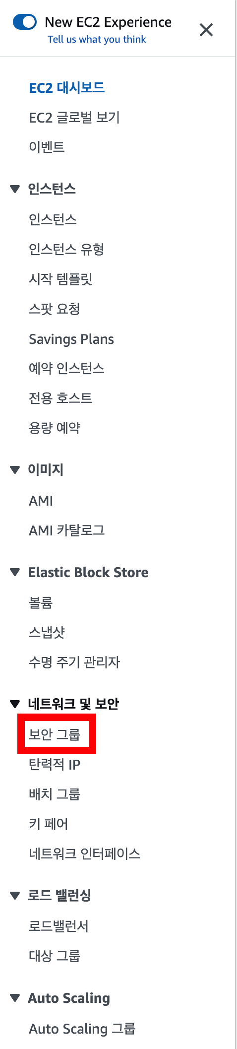 ec2의 왼쪽 메뉴바에서 "보안 그룹"을 클릭해 주세요.