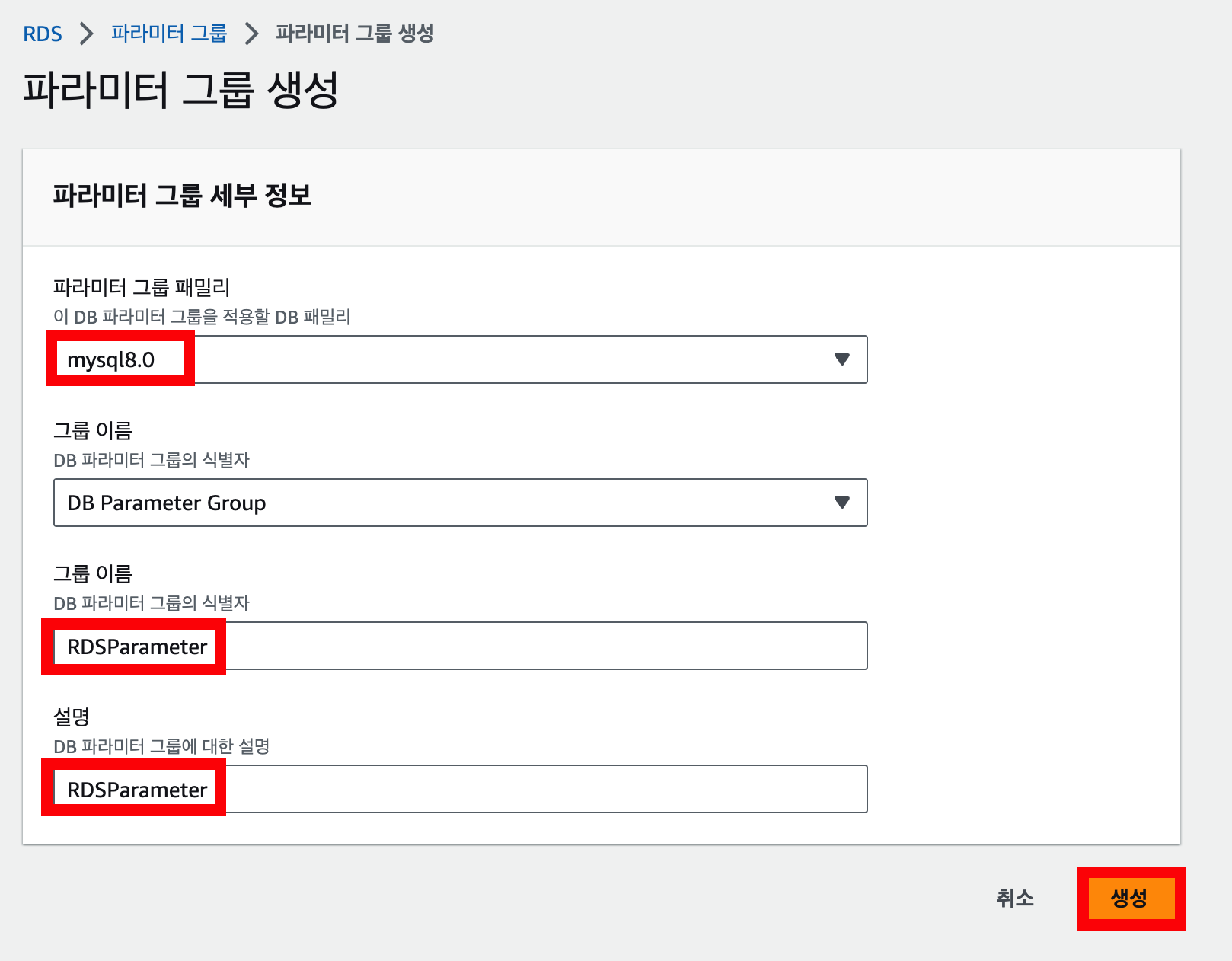파라미터 그룹 패밀리는 "mysql8.0", 그룹 이름과 설명은 원하시는 대로 입력해 주세요.