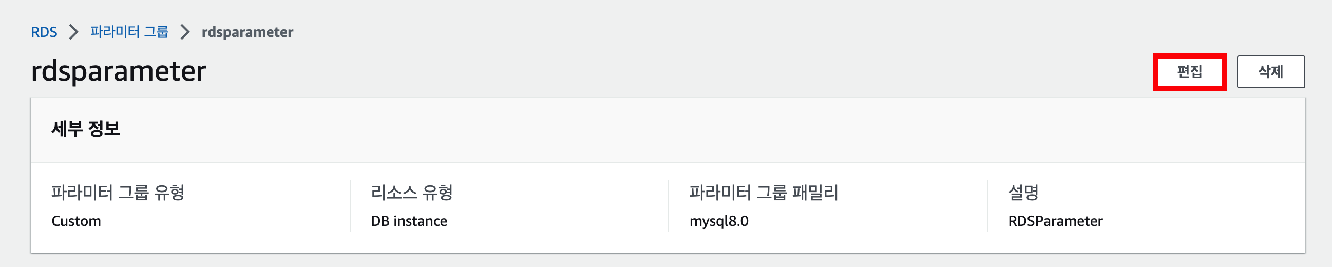 생성된 파라미터 그룹을 클락 하셔서 세부 정보로 들어온 다음 "편집"을 클릭해 주세요.