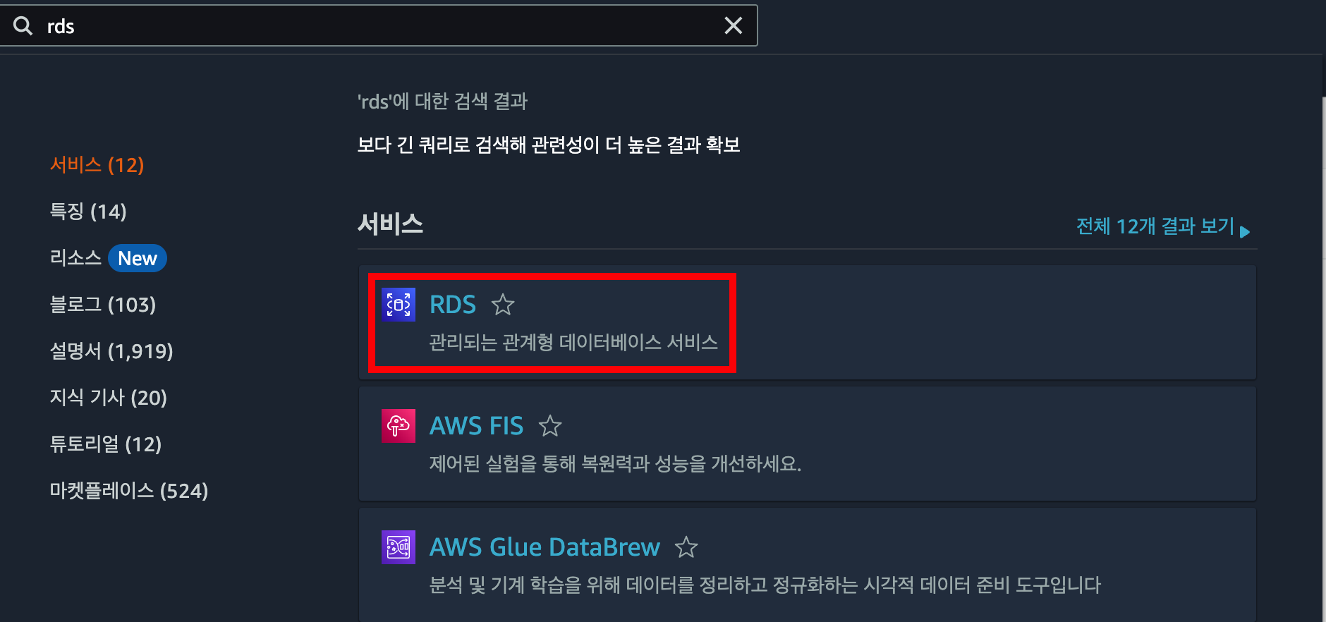 검색창에 rds를 검색하여 RDS 서비스 화면으로 이동해 주세요.