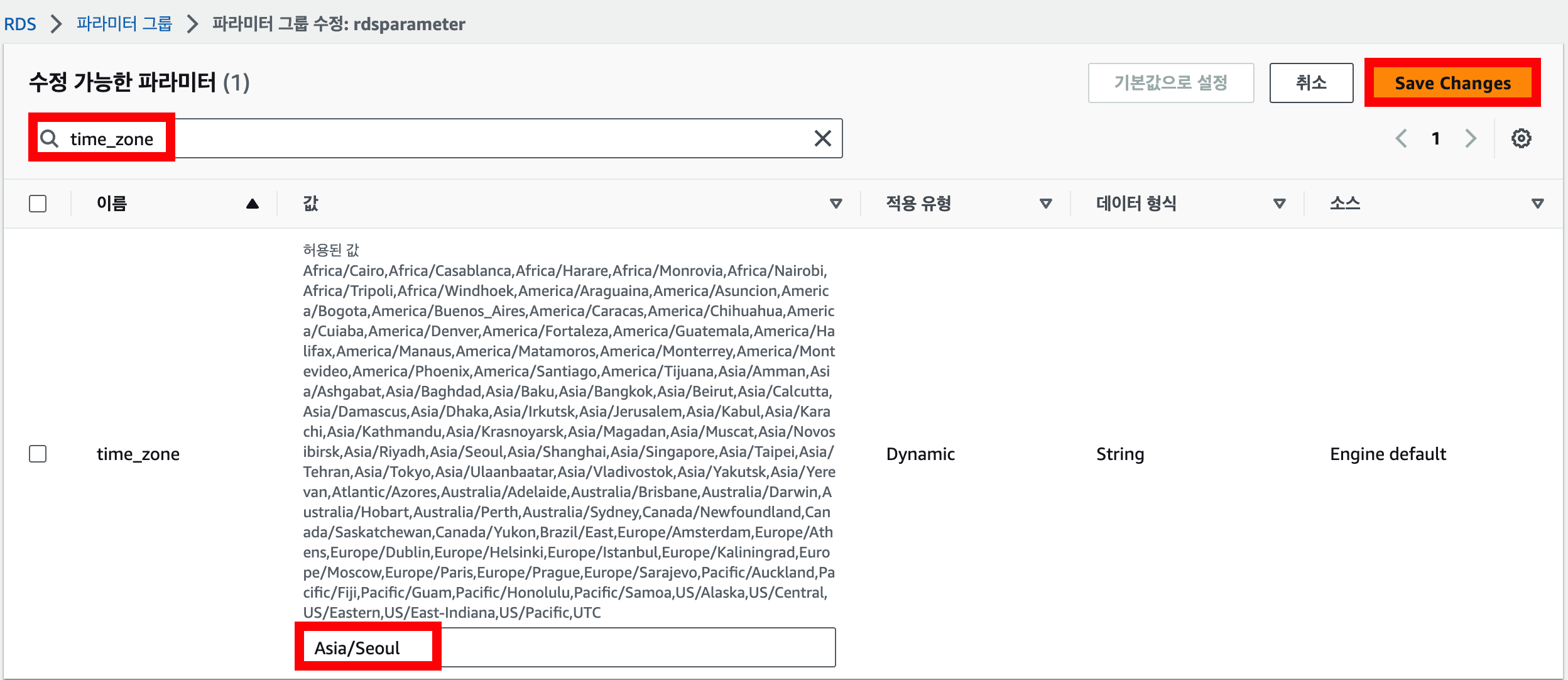 검색창에 "time_zone"을 입력 후 모든 입력창에 "Asia/Seoul"를 입력해 주세요.