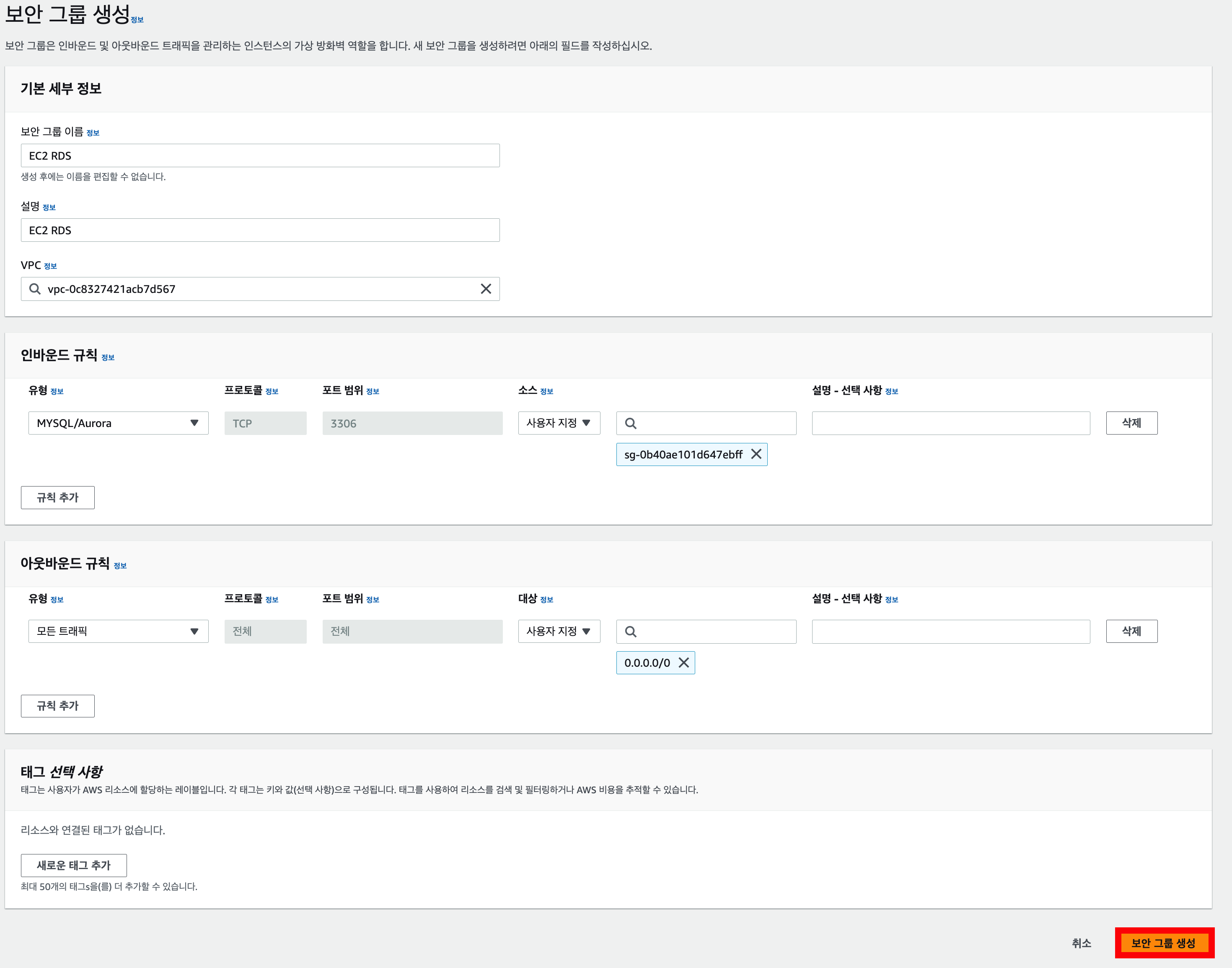 모두 잘 입력하셨다면, 아마 이런 화면일 겁니다. 그럼 이제 "보안 그룹 생성"을 클릭해 주세요.