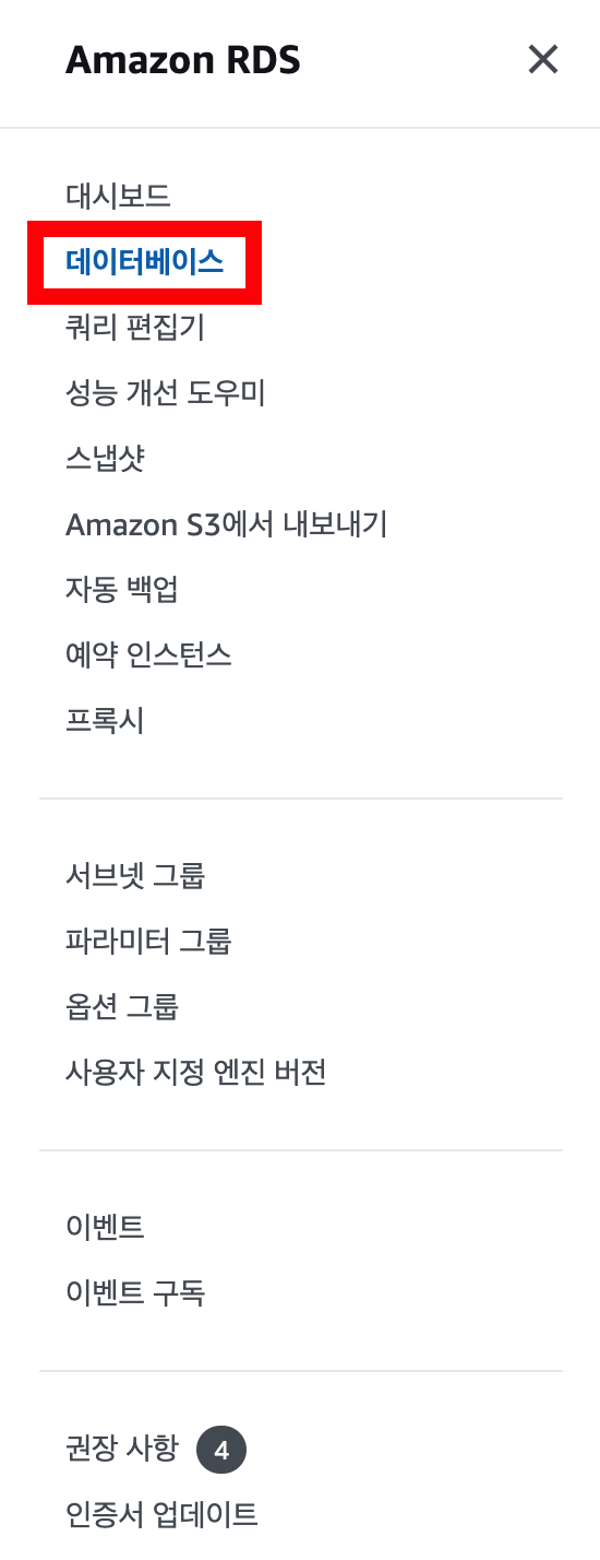 RDS 왼쪽 메뉴바에 "데이터베이스"를 클릭해 주세요.