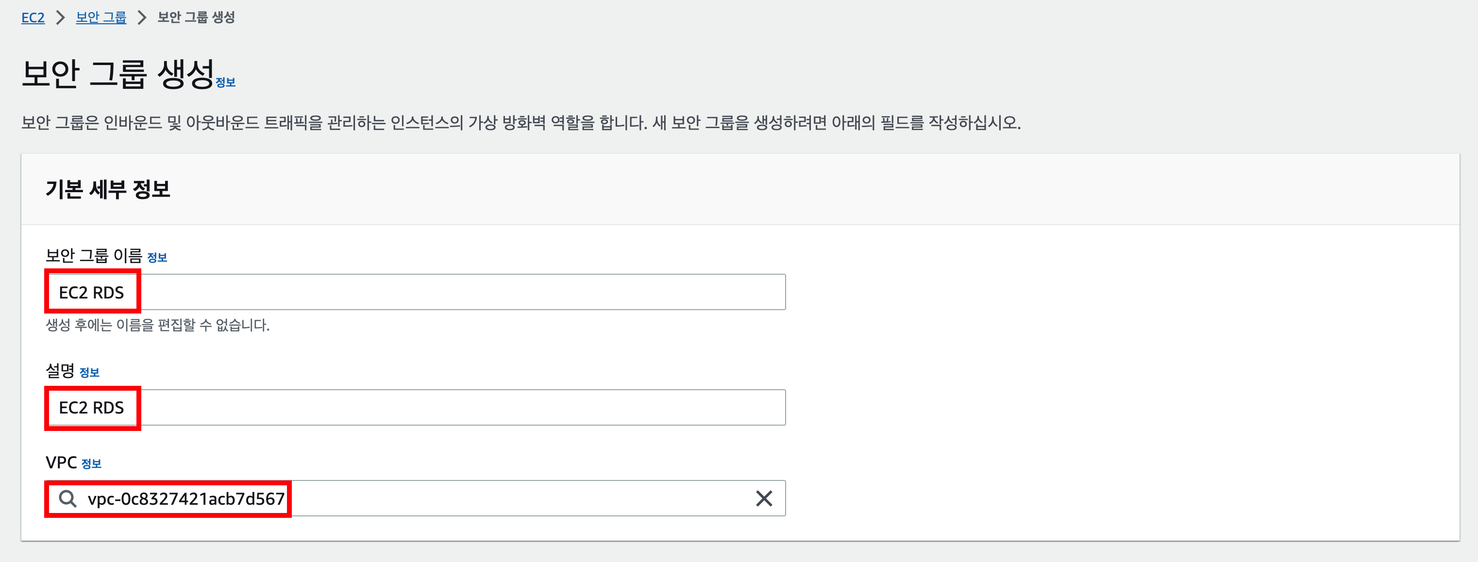 마찬가지로 이름과 설명은 원하시는 대로 입력해 주시고, VPC는 연동할 EC2 인스턴스의 VPC로 선택해 주세요.