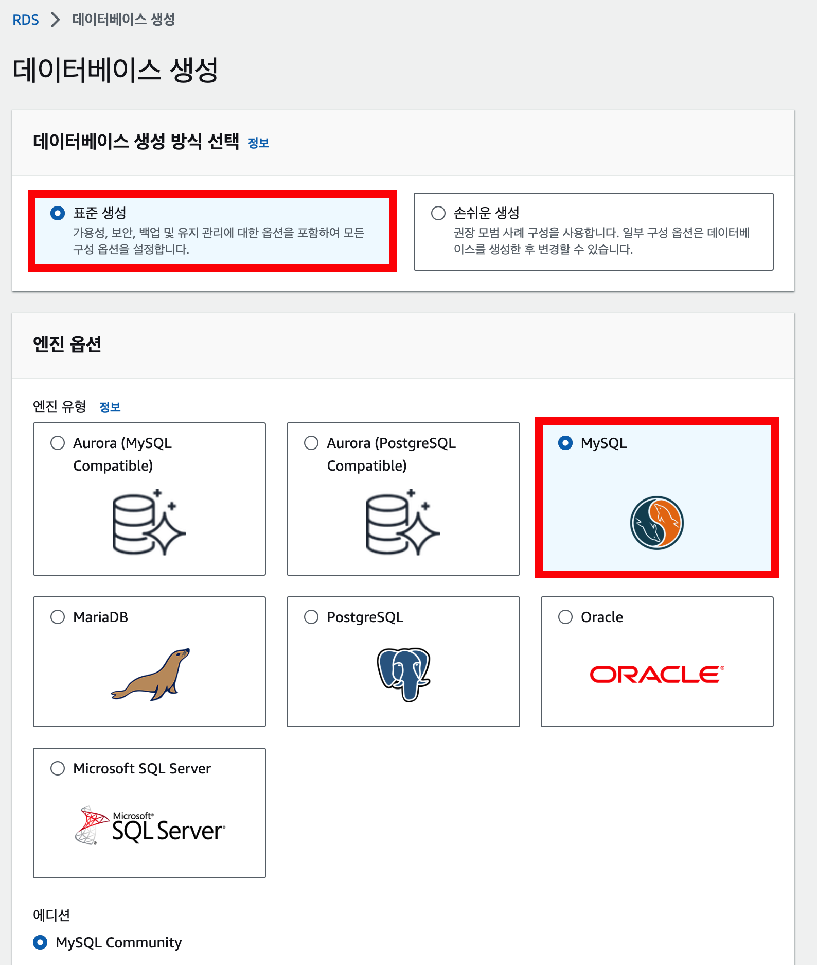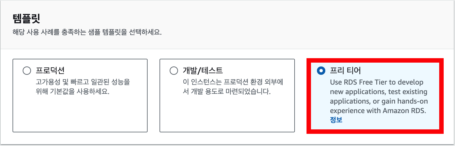 저는 엔진 옵션은 "MySQL"을 선택, 템플릿은 "프리 티어"로 선택!