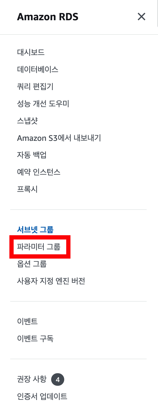 이번엔 RDS 왼쪽 메뉴바에 위치한 "파라미터 그룹"을 클릭해 주세요.