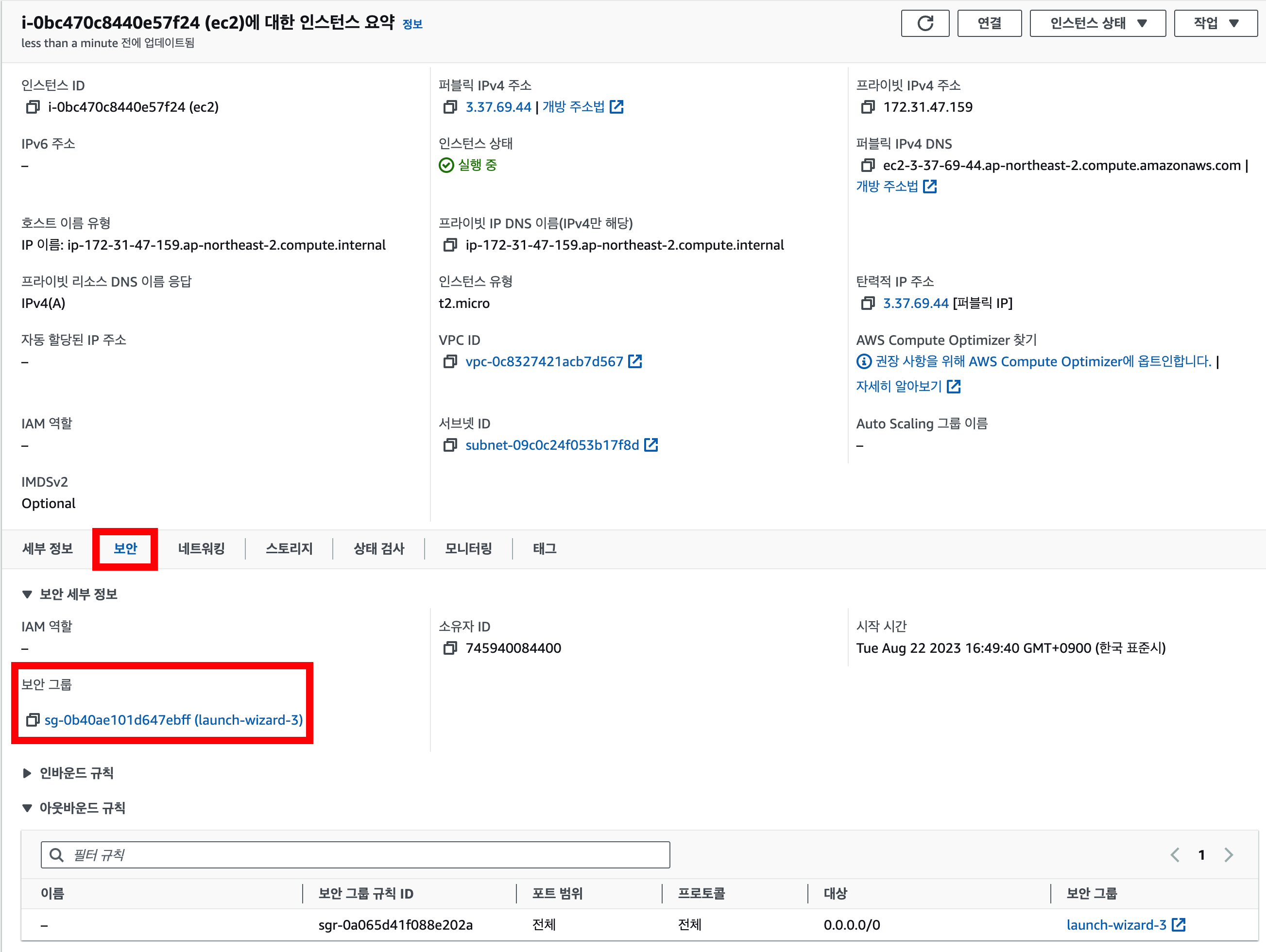 보안 그룹도 아까 생성한 보안 그룹으로 해주세요.
