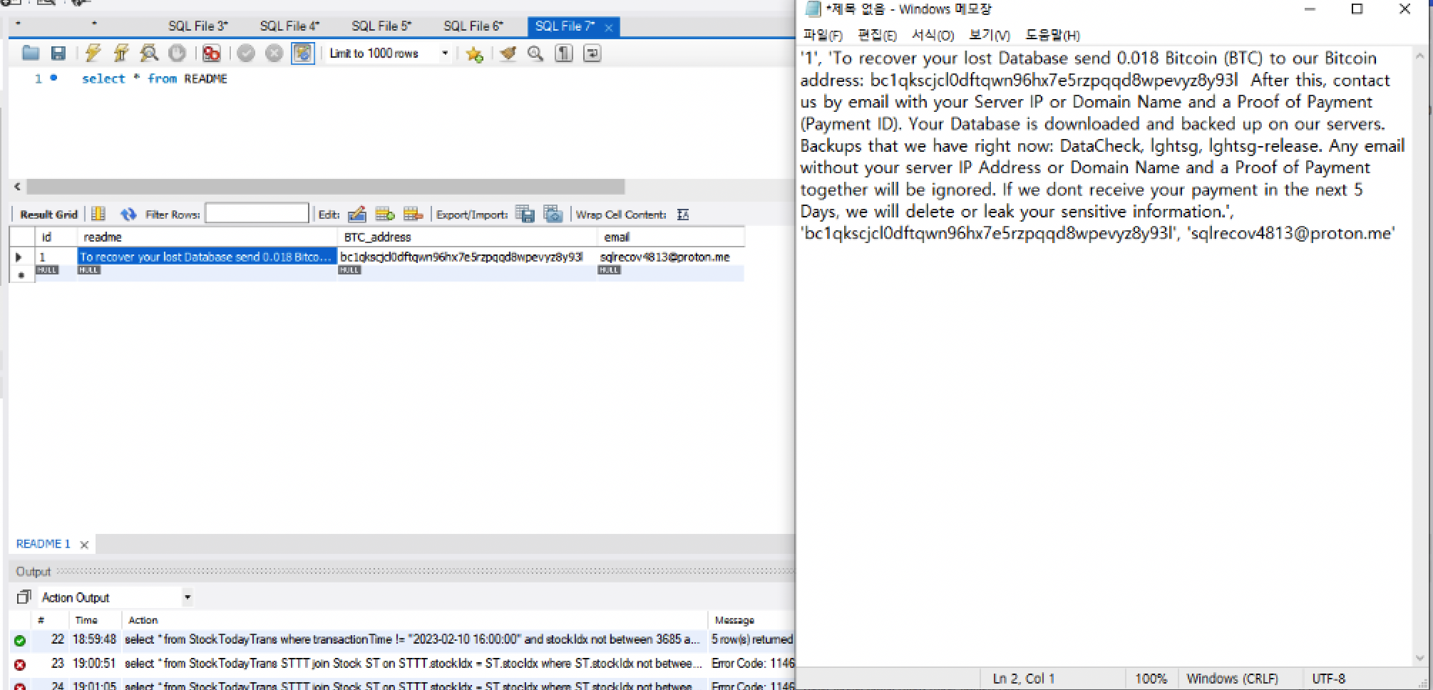 짜잔... 랜섬웨어에 당한 것이었습니다.. 테이블엔 데이터를 복구하려면 비트코인을 보내라는 텍스트와... 비트코인 주소만 덩그러니 남아있었습니다..