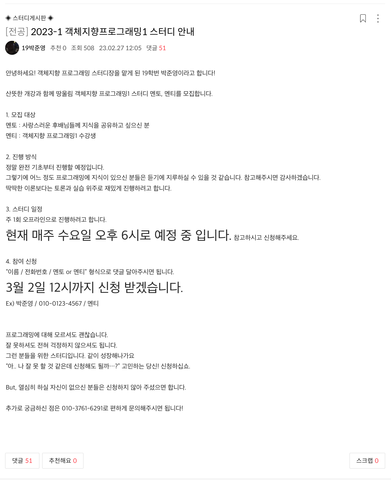 동아리 카페에 스터디원 모집글을 올렸고, 뜨거운 관심 속에 42명의 멘티 6명의 멘토 총 48명의 인원들과 함께 한 학기 동안 스터디를 진행했습니다. 이 정도 인원으로 스터디를 진행하는 건 동아리 역사상 처음이네요.. 아마 훌륭한 스터디장 덕분 아닐까요?^^