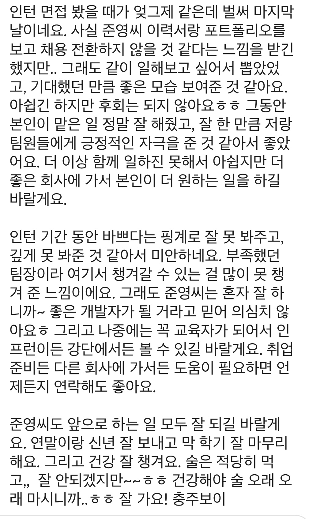 슬랙으로 팀원분들께 인턴 기간 동안 느꼈던 개인적인 감사함을 모두 전해드렸고, 정말 감동적인 말씀들을 받았다.