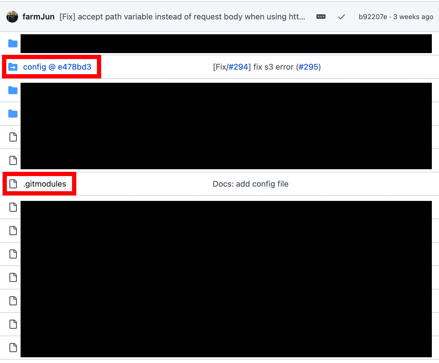 명령어가 잘 먹혔다면, 아래와 같이 private repo의 이름인 "config"로 디렉토리가 하나 생성되고, ".gitmodules" 파일이 생성됩니다.